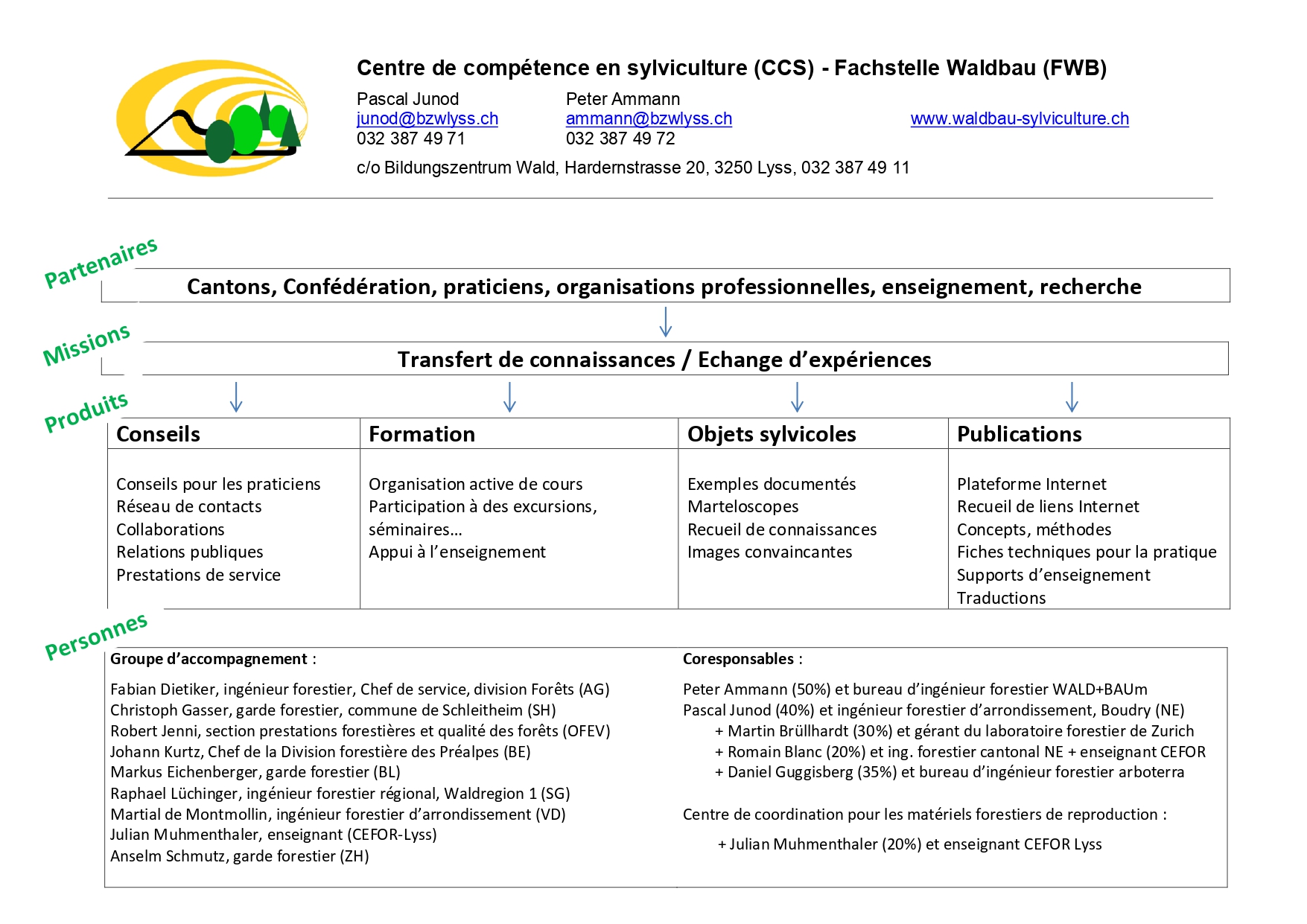 Le Centre de compétence en sylviculture a débuté son activité le premier mars 2011. Il est hébergé dans le Centre forestier de formation de Lyss, où il dispose d’un cadre de travail permettant de fructueux échanges. Son organisation s'inspire de celle du Centre de sylviculture de montagne, fondé en 1997, et dont l'expérience contribue largement au maintien et à la promotion des compétences sylvicoles en Suisse. La stratégie mise en œuvre par le groupe d'experts et les deux coresponsables du centre, est illustrée ci-dessous :